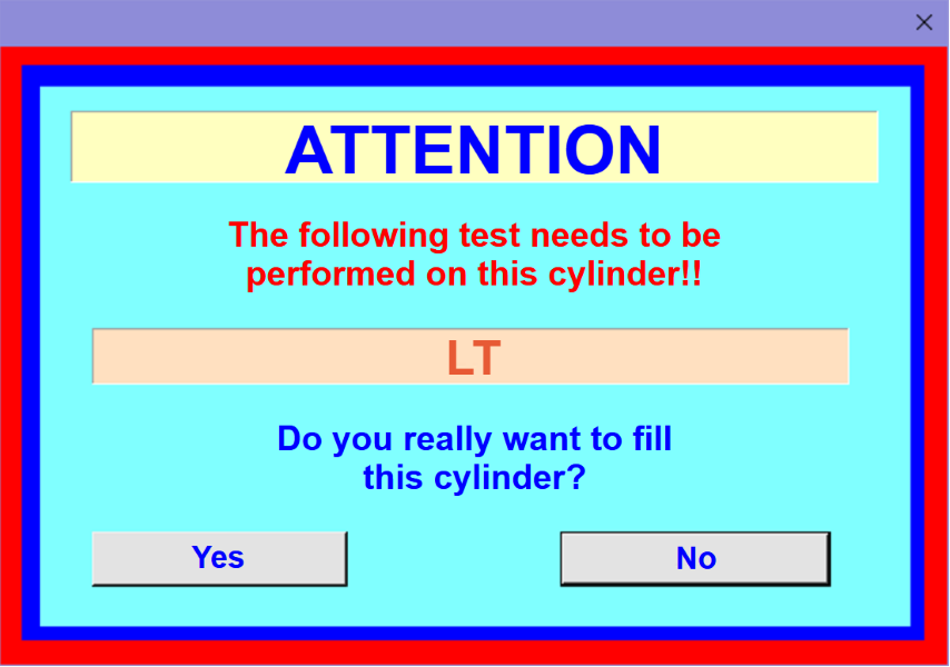 In “standard” mode and in “filling” mode (see above), the program uses the data stored in the database to automatically check whether or not a cylinder may be filled. If the cylinder in question has exceeded its next due date for testing, the program will alert you accordingly, asking you if you would like to fill the cylinder nonetheless.
