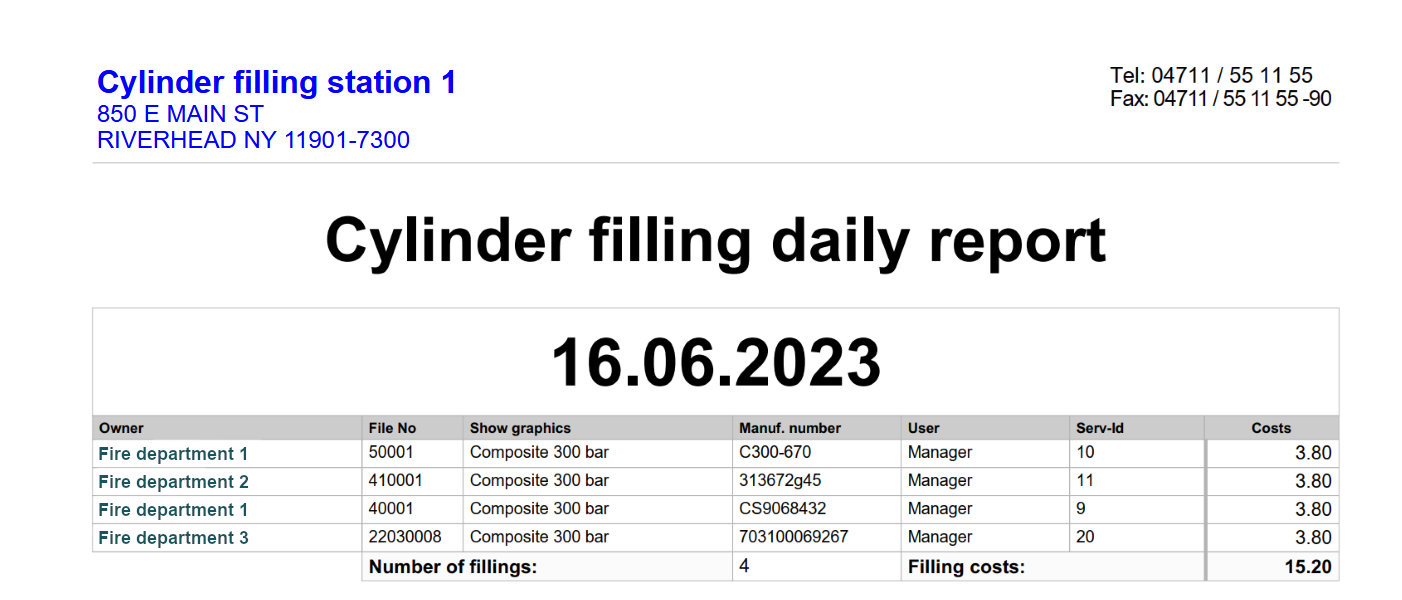 At any time, you can print a daily report or compile a number of statistics on the cylinders that have been filled.