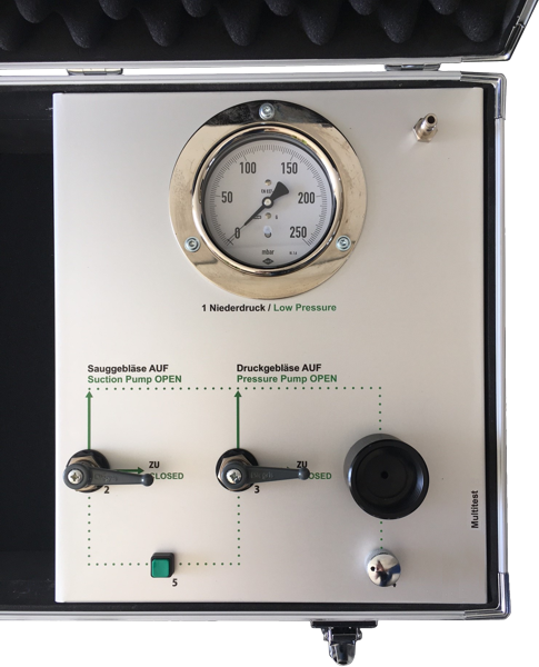 Für den Betrieb des Prüfgerätes ist ein Netzanschluss erforderlich. Der jeweilige Prüfdruck wird an einem Niederdruckmanometer abgelesen. Das Niederdruckmanometer verfügt über eine Kalibrierschraube mit der gegebenenfalls eine Nullpunktkorrektur des Zeigers vorgenommen werden kann.