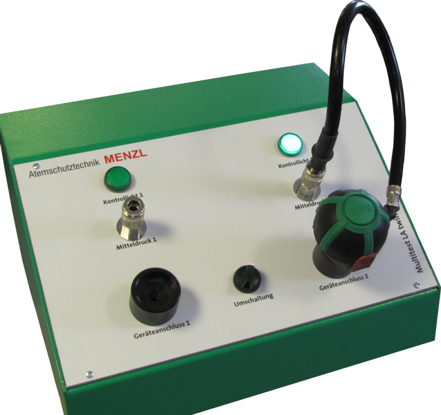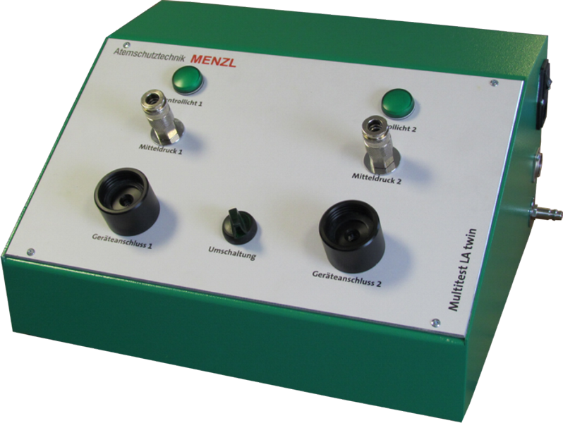 Das speziell für Prüfstellen, die sehr viele Lungenautomaten in kurzer Zeit zu prüfen haben, konzipierte Multitest LA twin ist ein robustes einfach zu bedienendes Doppel-Prüfpult zur Prüfung von Lungenautomaten im Nieder- und Mitteldruckbereich. Die im Prüfgerät eingebauten elektronischen Messstellen ermöglichen die direkte Übernahme der aufgenommenen Messwerte in die Geräteverwaltung. Das Grundgerät ist für die Prüfung von Geräten mit Rundgewindeanschluss und Eurokupplung ausgelegt. Für die Prüfung von Geräten mit anderen Anschlüssen sind entsprechende Übergangsadapter erhältlich. Öffnungs- und Schließdruckprüfungen werden mit Hilfe der eingebauten 230-Volt-Pumpe durchgeführt.
