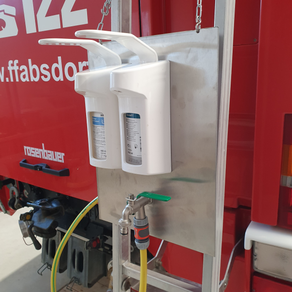 - Zwei Wandspender „Dermados 0,5“ für Reinigungs- und Desinfektionsmittel an der Vorderseite