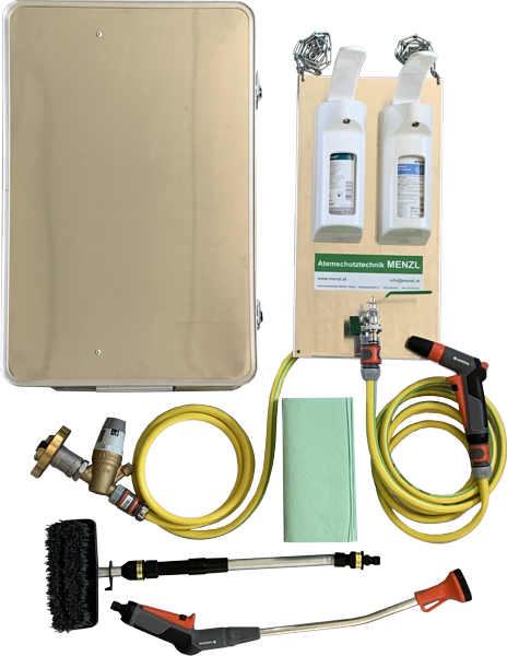 Die MENZL-Hygienebox besteht aus einer Aluminiumbox mit Scharnierdeckel und erlaubt die rationelle und sichere Lagerung der für Hygienemaßnahmen erforderlichen Geräte sowie Reinigungs- und Desinfektionskonzentrate.