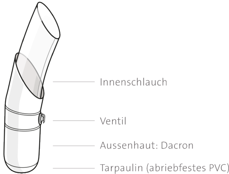 Die Kontrollreißverschlüsse ermöglichen an verschiedenen Stellen der Stützstruktur die Dacron-Außenhaut zu öffnen. Das gewährleistet einen problemlosen Austausch des Innenschlauches bei Bedarf.