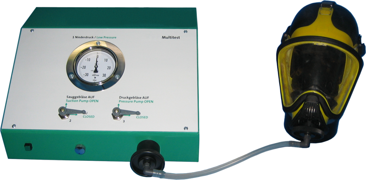 Lung-governed demand valves are connected to the equipment port for testing, while masks with five-point head harnesses are strapped onto the inflatable dummy head. The head, which comes with a clamp for fastening it to a table or a workbench, ensures that the masks sit properly on a human-like face during testing. In combination with optional accessories, Multitest ND Pult ME can also be used for testing many makes and models of two-point helmet masks.