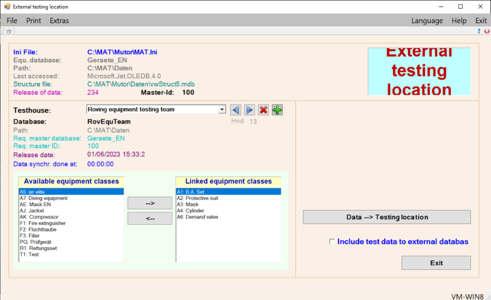 This program feature allows you to carry out equipment tests externally (for instance by means of a mobile equipment tester or a vehicle equipped for equipment testing) and subsequently transfer the recorded data into the main database. The computer used at the external point of testing requires a separate workstation licence. For data synchronization, it needs to be linked to the main computer via a network connection.