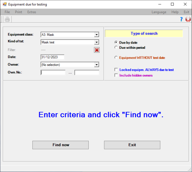 This program feature lets you search for equipment due for testing. Specifying the kind of equipment and the kind of test, you can search for equipment that is due for testing either by a given date or within a given period of time. The latter is particularly helpful in making provisions regarding replacement parts and/or the time needed to carry out the tests.