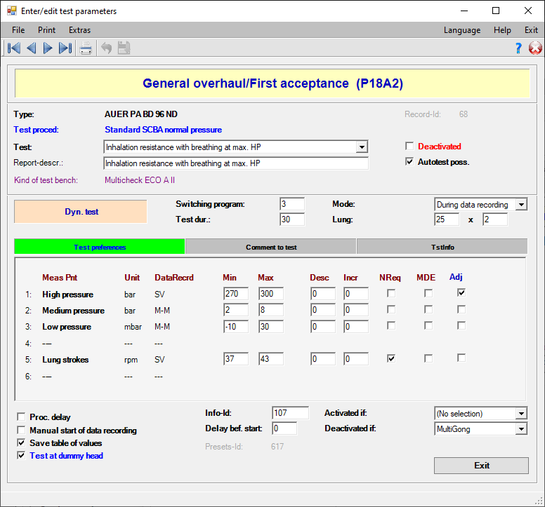 If you do not have a computer-assisted tester or if computer-assisted testing is not possible for the kind of equipment to be tested, you can use the manual-data-entry equipment testing window and record all of the required values manually by entering them into the respective data fields. Values entered manually are evaluated in the same manner as data recorded automatically.