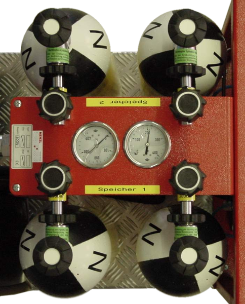Der wechselweise Betrieb bzw. Flaschentausch zwischen den vier Hochdruckanschlüssen erlaubt eine nahezu endlose Luftversorgung.