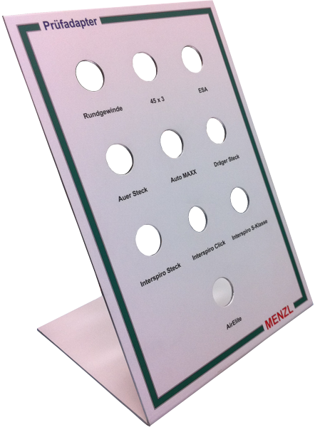 Schluss mit langwierigem Suchen nach den passenden Adaptern zur Prüfung von Atemschutzmasken und Lungenautomaten! Das MENZL-Adapterboard stellt die ideale Lösung für die griffbereite und übersichtliche Aufbewahrung von Adaptern dar. Mit seiner formschönen Ausführung in stabilem Alublech und einer widerstandsfähigen, farbig bedruckten ColorTec-Folie ist es zudem ein Blickfang in jeder Atemschutzwerkstätte. Beschriftete Aufnahmen erleichtern das rasche Erkennen des jeweils benötigten Adaptertyps ⁠– und am Ende des Prüftages lässt sich mit einem Blick erkennen, ob alle Adapter vollzählig vorhanden sind.