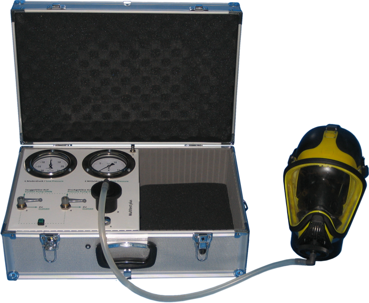 Der Prüfkopf ist auf einem Standsockel montiert und mit einer Füllleitung samt Druckknopfventil zum Aufblasen bzw. Entlastungsventil zum Entlüften des Kopfes versehen. Für das Aufblasen des Prüfkopfes wird Druckluft benötigt. Diese kann der Mitteldruckleitung eines Pressluftatmers oder einer stationären Luftversorgung entnommen werden.
