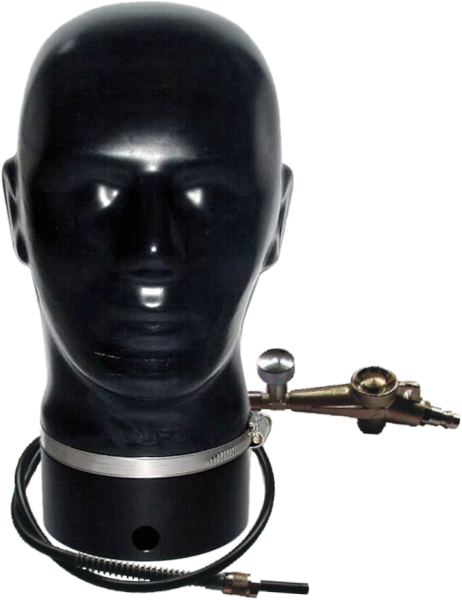 Den Prüfkopf auf eine normal große Kopfform aufblasen. Dazu die Füllleitung an eine Luftversorgung anschließen und das Druckknopfventil kurz betätigen.